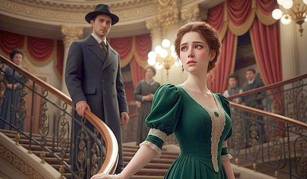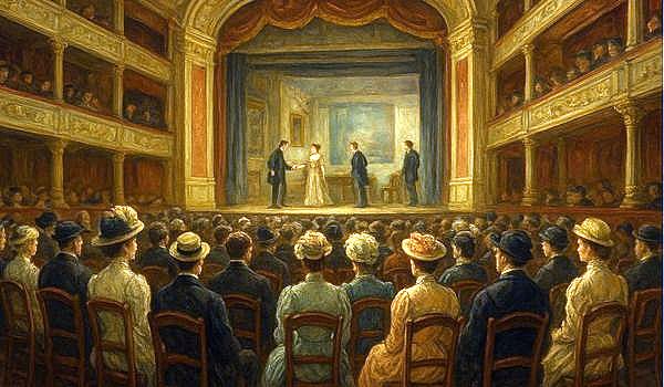 थियेटर भरा हुआ था। छोटे शहरों के सभी थियेटरों की भाँति यहाँ भी फानूस के ऊपर धुन्ध छाई हुई थी, ऊपरी बाल्कनियों में ख़ूब शोर हो रहा था; पहली कतार के आगे शो शुरू होने से पहले स्थानीय छैले पीठ पर हाथ बांधे खड़े थे।