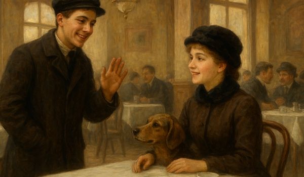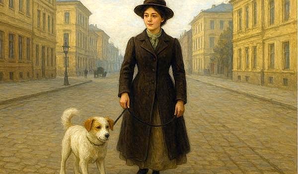 वेर्ने के मण्डप में बैठे हुए उसने तटबंध पर मंझले कद की, हल्के सुनहरे बालों वाली एक महिला को घूमते देखा। वह बेरेट पहने थी, और उसके पीछे-पीछे पोमेरानियन नस्ल का छोटा-सा सफ़ेद कुत्ता दौड़ रहा था।