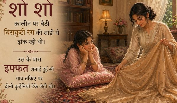 शो शो क़ालीन पर बैठी बिसकुटी रंग की साड़ी से अपनी नंगी पिंडली को ढांक रही थी। उस के पास इफ्फत शर्माई हुई सी गाव तकिए पर दोनों कुहनियाँ टेके लेटी थी।
