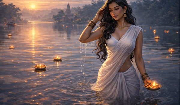 उधर सरयू नदी में स्नान करके जब उठी, वह अत्यंत सुंदर प्रतीत हो रही थी. उसका नियम था कि नित्य प्रातः-सायं वह गंगास्नान के लिए घर से कुछ देर चलकर इधर एकांत में स्नान करने आती. कभी-कभी गंगा की धार पर प्रवाहित उसका दीपदान विस्तृत जलराशि के फेनोच्छ्वसित विलास गांभीर्य पर लगे संध्या तारे की भांति टिमटिमा उठता था.